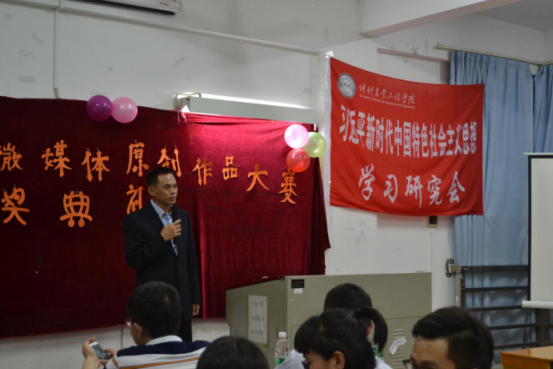 颁奖环节结束后,蔡立彬院长为此次颁奖大会致辞,充分肯定了此次活动,鼓励同学们日常学习生活中多研读十九大报告,认真学习十九大精神,培养正确的理想信念和人生观念,用自己所学更好地服务社会。最后,蔡立彬院长对学习会的发展提出了几点建议,对学习会未来的发展也寄予极大希望。