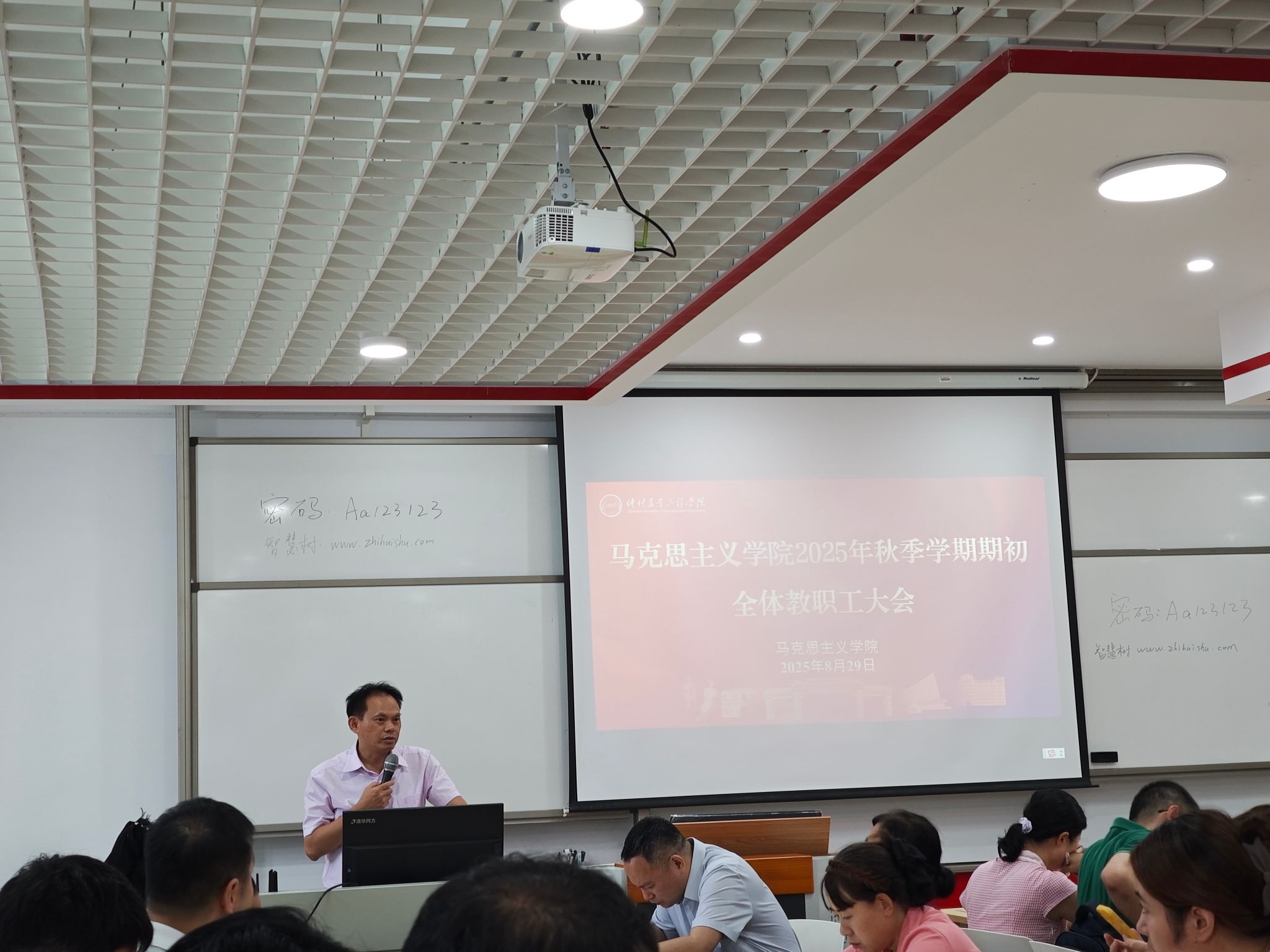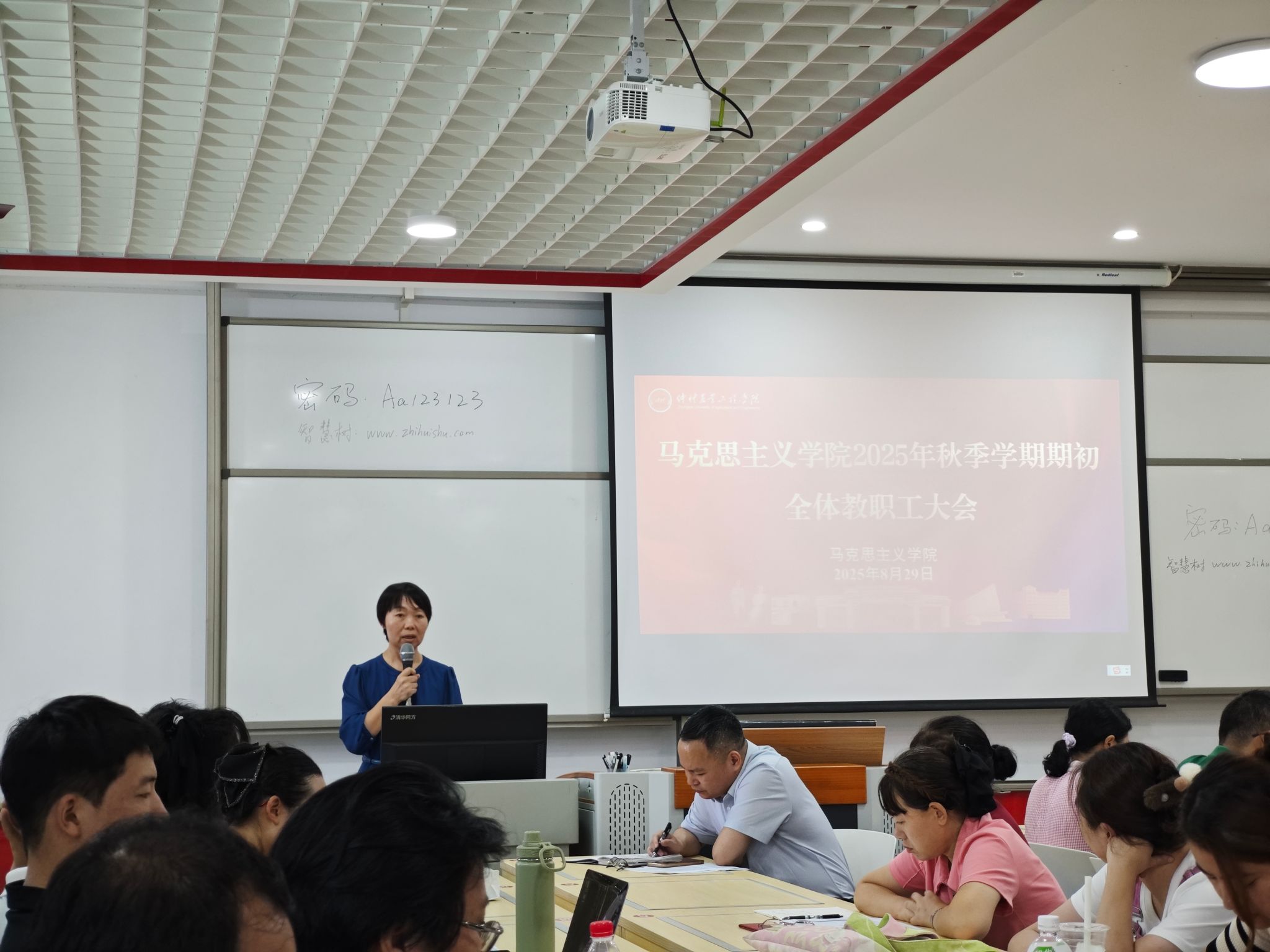 蔡立彬向教职工传达了学校学期初工作会议的精神,强调了学校在新学期的工作任务和重要部署,他表示学院全体教职工务必以使命担当之姿,对标学校发展需求,提升自身教学和科研能力,为学校发展提供“加速度”。