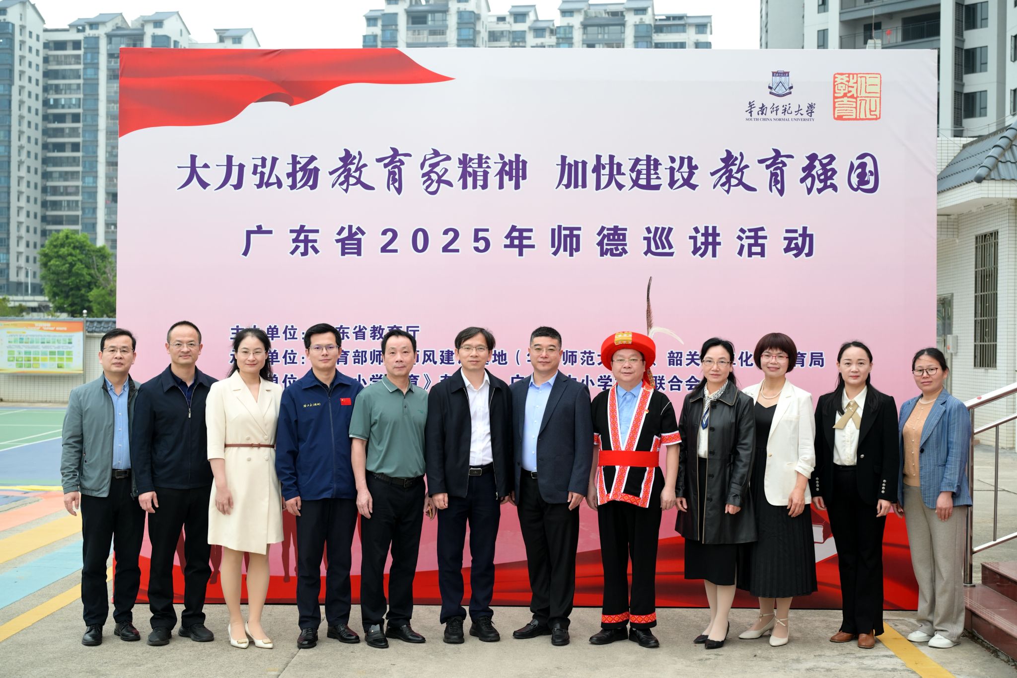本次活动由广东省教育厅主办,教育部师德师风建设基地(华南师范大学)、韶关市仁化县教育局承办,《中小学德育》杂志社、广东省中小学校长联合会、韶关市仁化县田家炳小学协办。华南师范大学教师教育学部党总支书记、教育部师德师风建设基地(华南师范大学)副主任华维勇同志;教育部师德师风建设基地(华南师范大学)活动策划与宣传部负责人、《中小学德育》杂志社副社长谢光灵同志;仁化县委教育工委书记、仁化县教育局党组书记、仁化县教育局局长李子初同志;仁化县教育局副局长邓伟强同志;哈尔滨工业大学(深圳校区)党委宣传部副部长陈南坤同志出席了本次巡讲活动。以及来自韶关市仁化县中小学校长、骨干教师代表共200余人现场参加,全省各地市约50万人次线上观看。