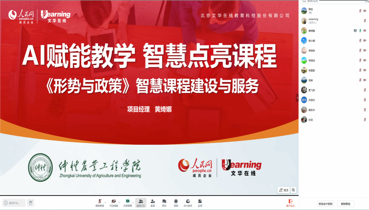 会上,文华在线项目黄经理首先从技术赋能、平台构建、资源整合三大维度,全景式展示了智慧课程建设的整体规划。项目将依托“优学院”和“人民公开课”等国家级智慧教育平台,运用AI技术打造课程知识图谱、智能备课系统及个性化学习路径等模块,实现教学内容精准化、教学过程智能化、学习评价动态化。项目将深度融合思政元素,通过大模型训练与专有知识库建设,强化形势与政策课程思政引领力,夯实立德树人根基。