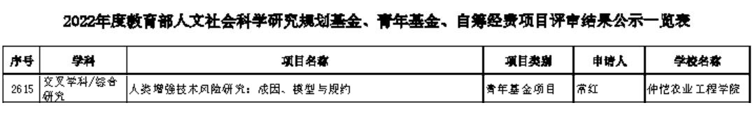 7月29日,教育部社科司发布了2022年度教育部人文社会科学研究项目一般项目评审结果的公示,我院常红副教授申报的青年基金项目“人类增强技术风险研究:成因、模型与规约”获得立项,这是常红副教授在人类增强技术的哲学研究领域,继2020年获得广东省哲学社会科学“十三五”规划项目“新兴人类增强技术的哲学诠释学研究”之后,又获得的一项部级项目。