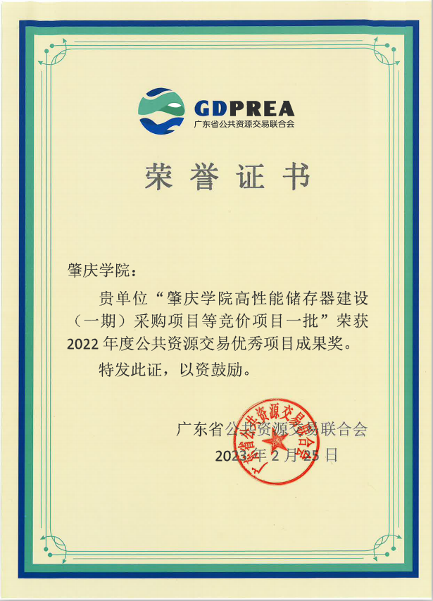 据悉,本次活动共评选出“广东省 2022 年度公共资源交易改革创新优秀成果奖”8 个,“广东省 2022 年度公共资源交易优秀项目成果奖”56 个。bat365申报教育设备更新改造项目“bat365正版唯一官网高性能储存器建设(一期)采购项目等竞价项目一批”荣获2022年度公共资源交易优秀项目成果奖。