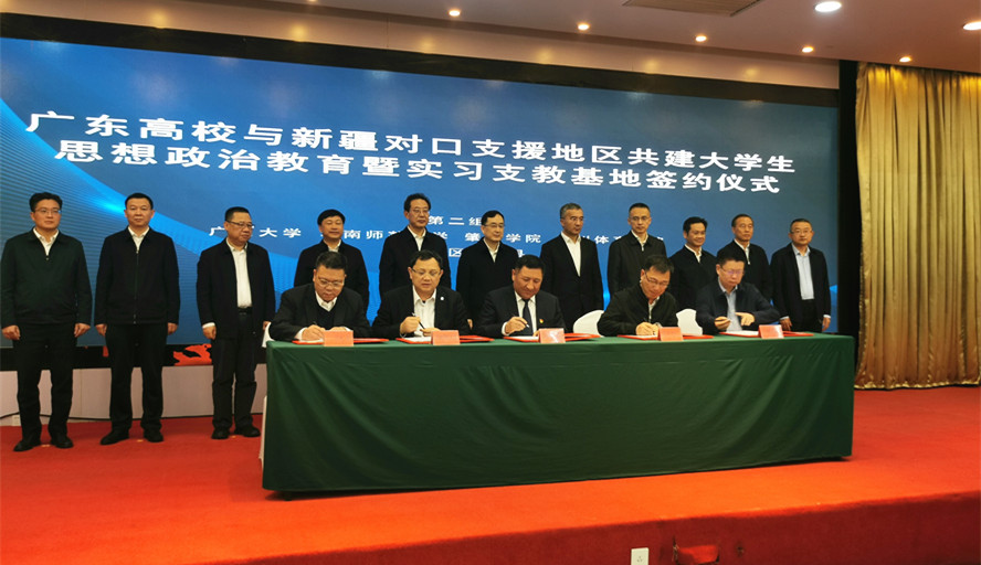 本网讯 3月26日,广东高校与新疆对口支援地区共建大学生思想政治教育暨实习支教基地(以下简称“校地共建”)签约仪式在新疆喀什举行。粤新两地领导出席签约仪式。bat365党委副书记谢冠华,党委委员、组织部部长欧洪湛,教育科学学院党委副书记刘远君等参加活动。