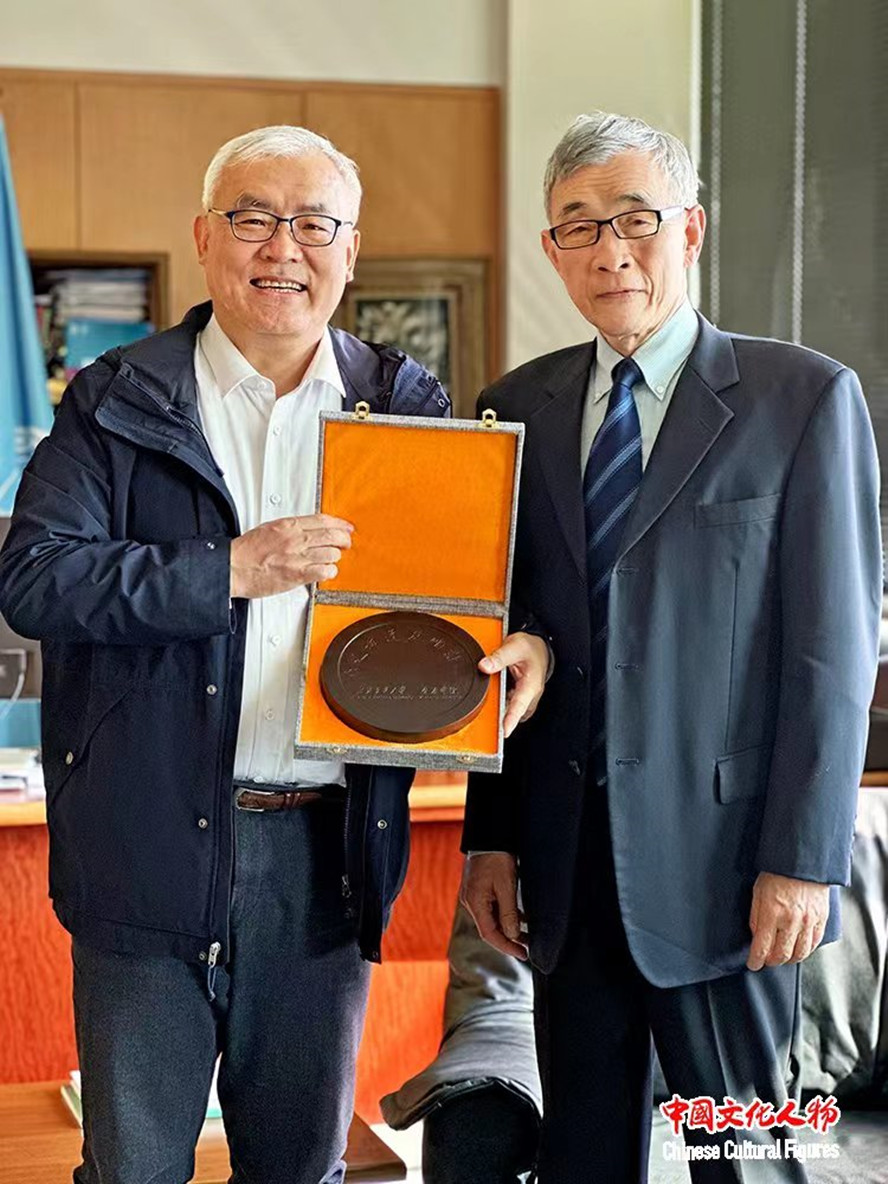图为曲星大使(右一)代表联合国教科文组织接受周斌教授(左一)赠与