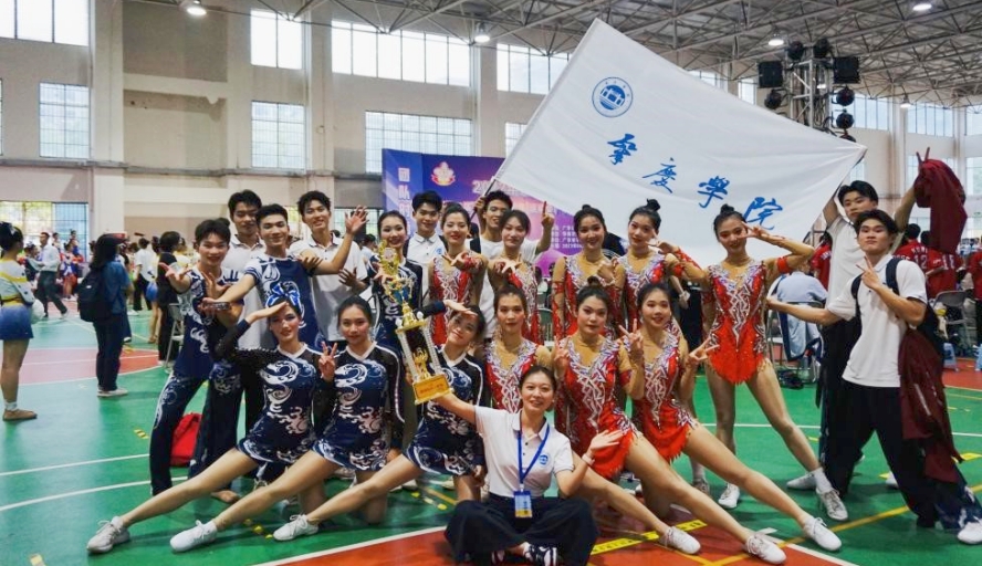 本网讯 4月21至23日,2022年广东省大学生啦啦操锦标赛暨第一届全国学生(青年)运动会广东校园组代表团大学啦啦操项目选拔赛在华南农业大学珠江学院举行。bat365首次参加本项赛事,共派出21名学生参加5个团体项目的竞逐,最终斩获2金、2银、1铜,获得乙组团体总分第一的好成绩,在兄弟院校面前展示了良好的风采。