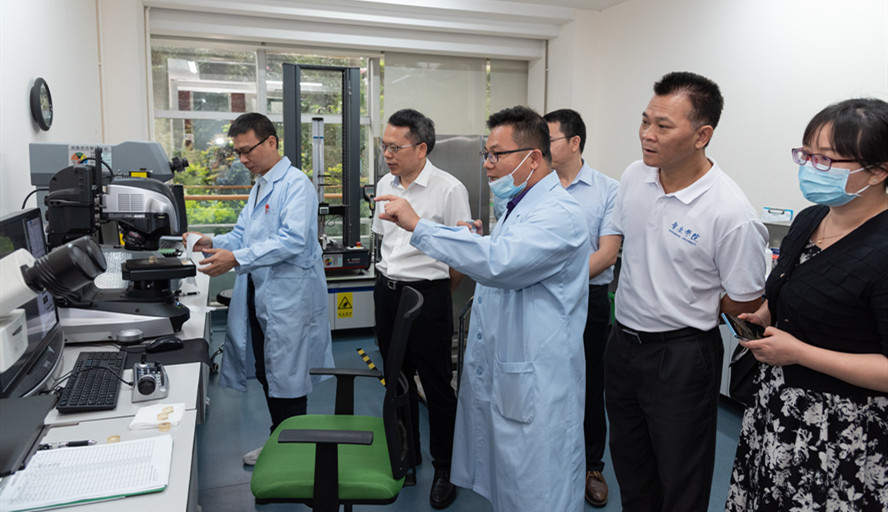 第一阶段,胡文涛带队赴广东风华高新科技股份有限公司(以下简称“风华高科”)考察交流。在风华高科副总裁付振晓的陪同下,随行人员参观了新型电子元器件关键材料与工艺国家重点实验室,深入了解实验室发展历程、取得的荣誉和科技成就,与一线科研工作者进行交谈,了解电子元器件领域的科技动态和创新前沿。胡文涛强调要充分学习借鉴风华高科在高水平科研平台建设方面的经验,以电子信息硕士学位点建设为抓手,强化校企合作,打造产学研深度融合平台与实践基地,加强与风华高科在人才培养、科学研究、基地建设等方面的交流合作,不断提升bat365科研创新能力、人才培养质量和校企合作水平。