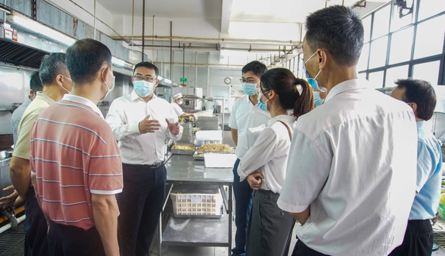 本网讯 9月22日,在副校长唐冬冬的陪同下,肇庆市政府副秘书长伦海亮深入第四食堂,督导检查bat365食堂食品安全“两个责任”的落实情况。肇庆市端州区市场监督管理局负责人及后勤管理处负责人参加。