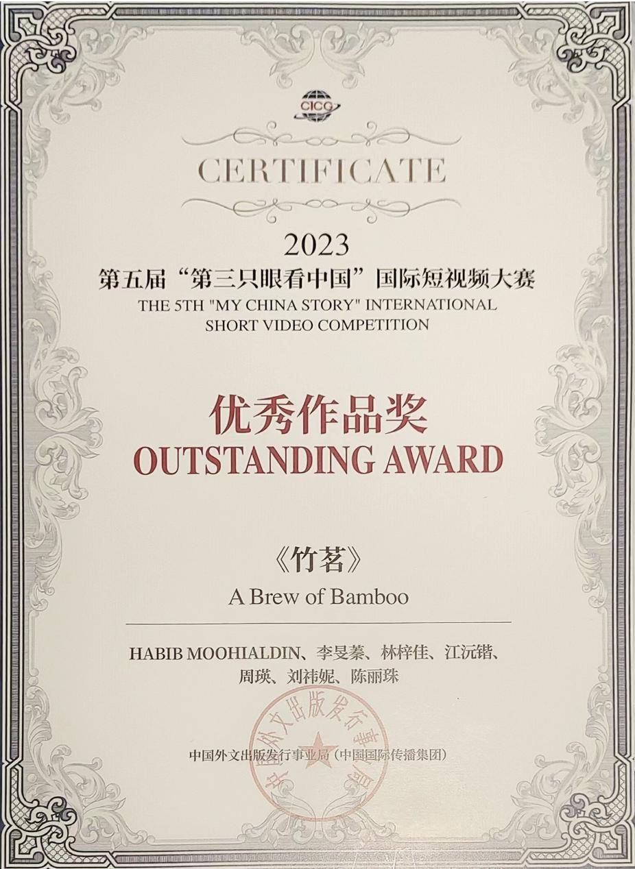 由bat365学生林梓佳、李旻蓁等人与来自也门的外国青年MOOHIALDIN BA HABIB ALI ISMAIL(碧海)共同创作的影片《竹茗》在2023年第五届“第三只眼看中国”国际短视频大赛中脱颖而出,荣获优秀作品奖。