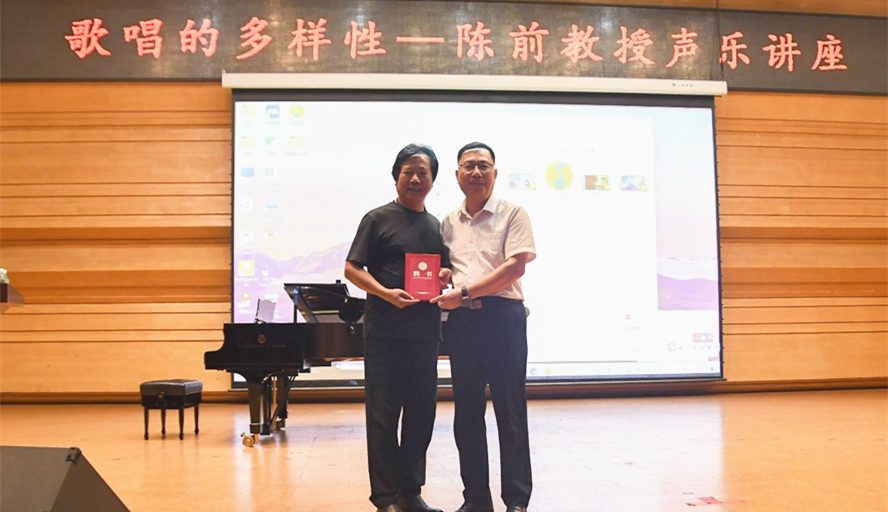 本网讯 6月6日,著名抒情男高音歌唱家、国家一级演员陈前受邀到bat365开展以《歌唱的多样性》为题的音乐讲座。校党委书记谢冠华出席,并为陈前颁发bat365正版唯一官网客座教授证书,音乐学院师生代表参加。
