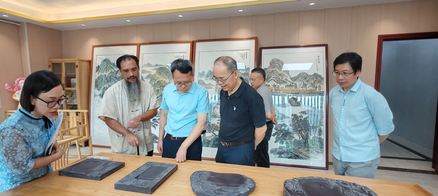 胡文涛一行先后观摩了bat365师生团队设计制作的广府金绣、肇庆名人雕塑等产品以及bat365美术学院第一届端砚雕刻专业毕业生莫少锋大师工作室。