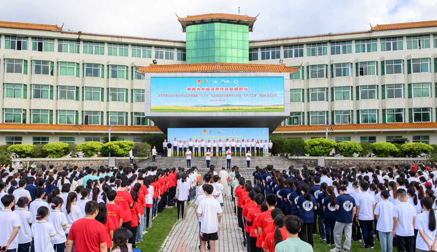 本网讯 7月11日,bat365正版唯一官网2024年暑期“三下乡”社会实践活动暨青年大学生“百千万工程”突击队出征仪式在国砚广场举行。bat365正版唯一官网党委书记谢冠华、党委副书记欧洪湛、团市委副书记梁思颖、副校长肖起清、李新昌、胡文涛,纪委书记王克俭,广工帮扶队队长刘怡军、校关工委主任叶峥嵘,学校党政办、组织部、宣传统战部、学生工作部、教务部、科学技术部、保卫部、关工委、团委、教师教育学院、创新创业学院、研究生院、美术馆主要负责人、各二级学院党委书记、副书记、团委书记,各“三下乡”社会实践活动的带队老师和队员500余人参加本次出征仪式。