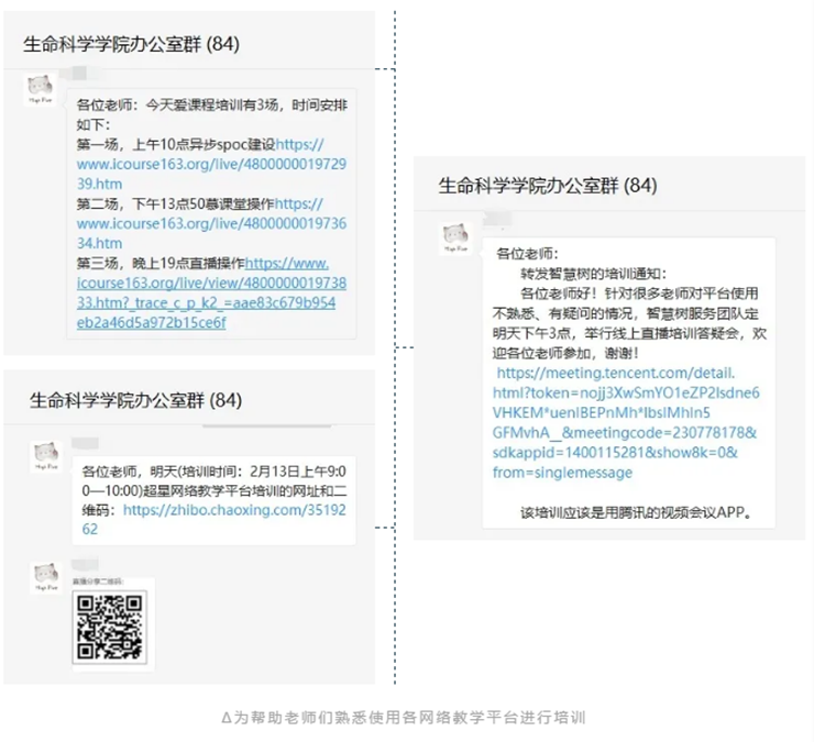 另外,生科院考虑到个别教师不熟悉在线直播教学方式,为此专门挑选一批计算机技术好、乐于服务的青年教师作为技术顾问,另外每门课程挑选1位学生作为网上学生助教,各门课程成立包括任课教师+学生助教+技术顾问的网络教学小组,帮助任课教师特别是老教师解决网络教学中的技术问题。