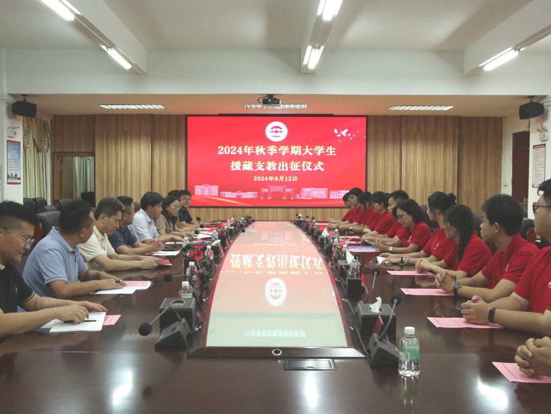 8月12日,bat3652024年秋季学期援藏支教出征仪式在临峰厅举行。学校党委副书记欧洪湛、学生工作部班子成员,支教队员所在学院党委负责人、第十四批援藏支教服务队全体成员出席参与,仪式由学生工作部(招生与就业指导中心)部长陈玉华主持。