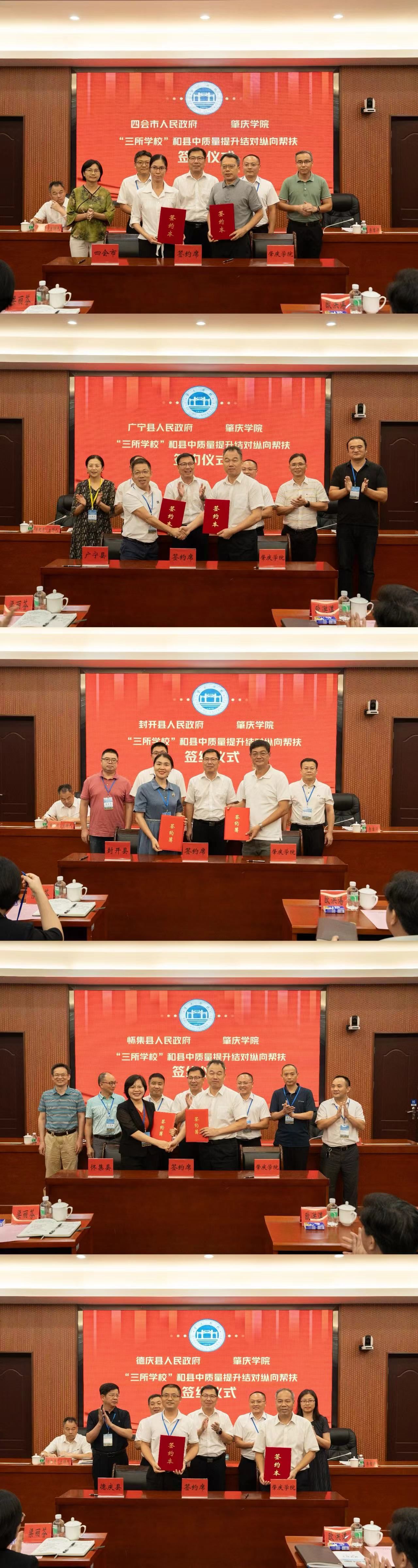 仪式上,学校代表分别与四会市、广宁县、德庆县、封开县、怀集县政府代表轮流上台签署校县合作协议,并合影留念。