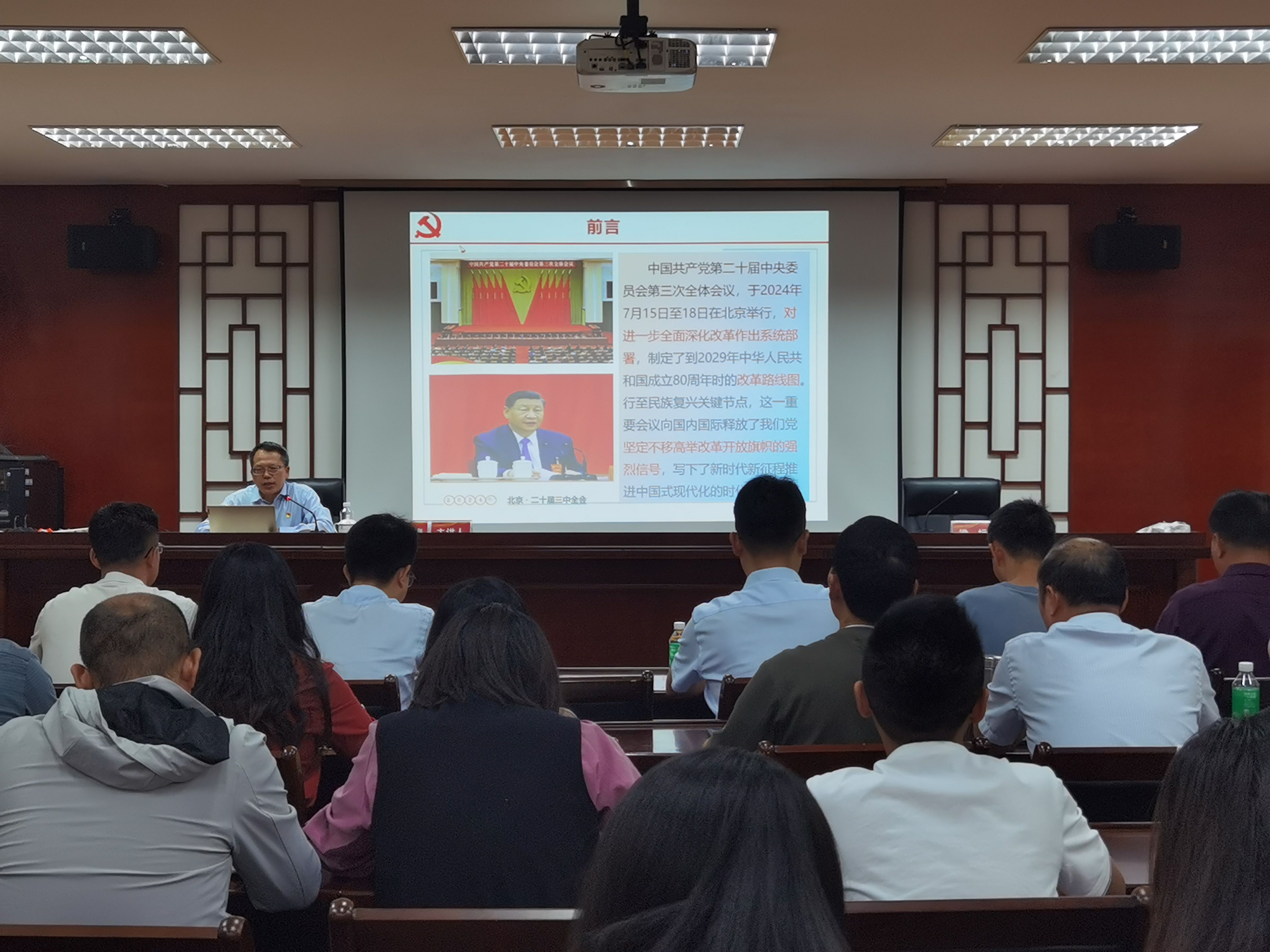 胡文涛结合当前国际形势和我国发展实际,深入浅出地阐述全面深化改革的重大意义、总体要求。他指出,当前世界正处于百年未有之大变局,国际竞争日趋激烈,风险挑战层出不穷。面对这样的形势,我们必须进一步全面深化改革,用完善的制度来防范化解风险、有效应对挑战,从而在危机中育新机、于变局中开新局。