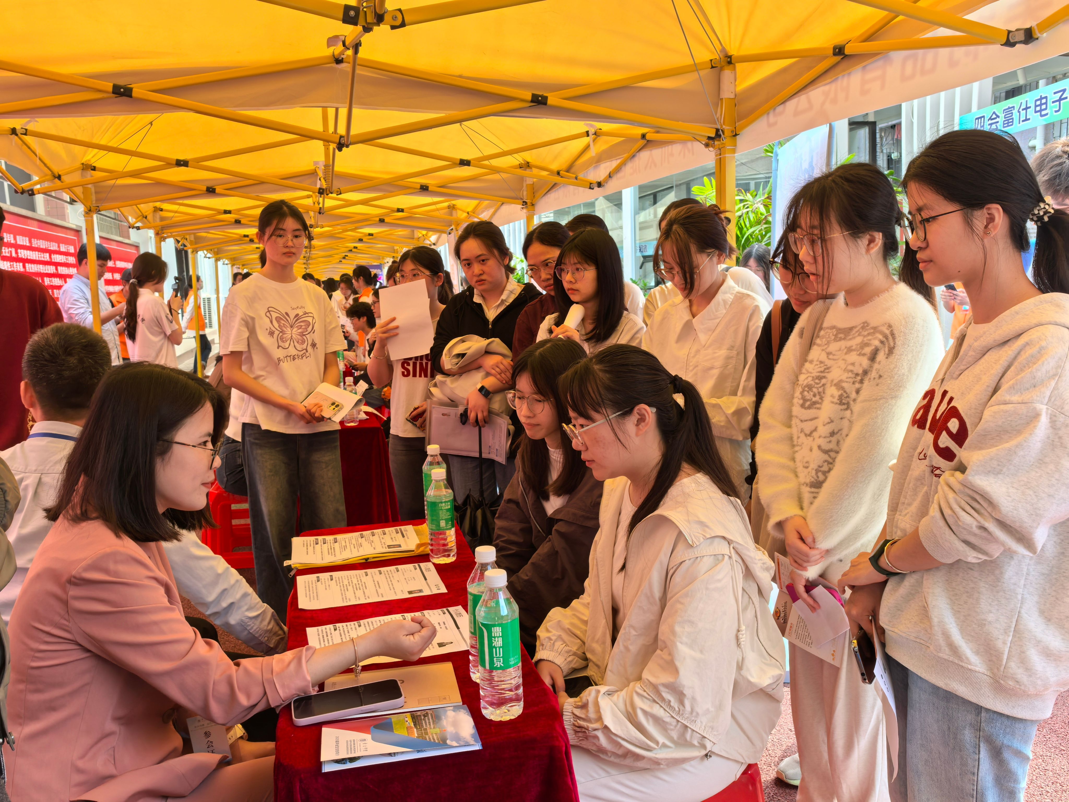 欧洪湛深入招聘展位了解企业用人需求和人才市场发展,和企业招聘代表以及求职应聘的学生们进行了深入的交流。另外,他向优秀校友企业提出,今年是学校办学55周年,邀请他们参加学校55周年校庆。