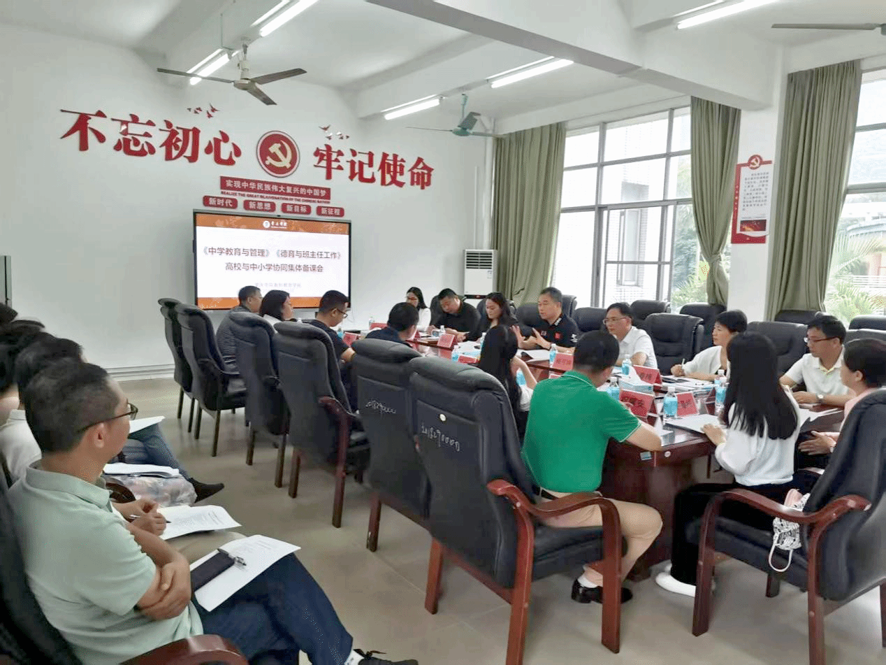 本网讯 4月25日,教师教育学院举办《中学教育与管理》《德育与班主任工作》高校与中小学协同集体备课会。本次活动邀请了肇庆市中小学名校长、优秀班主任组成的专家团队与教师教育学院教师共同研讨师范生培养方案。学校副校长肖起清出席、教师教育学院(教师发展中心)党总支书记植可焕,全体任课教师参加。教师教育学院副院长薄艳玲主持备课会。