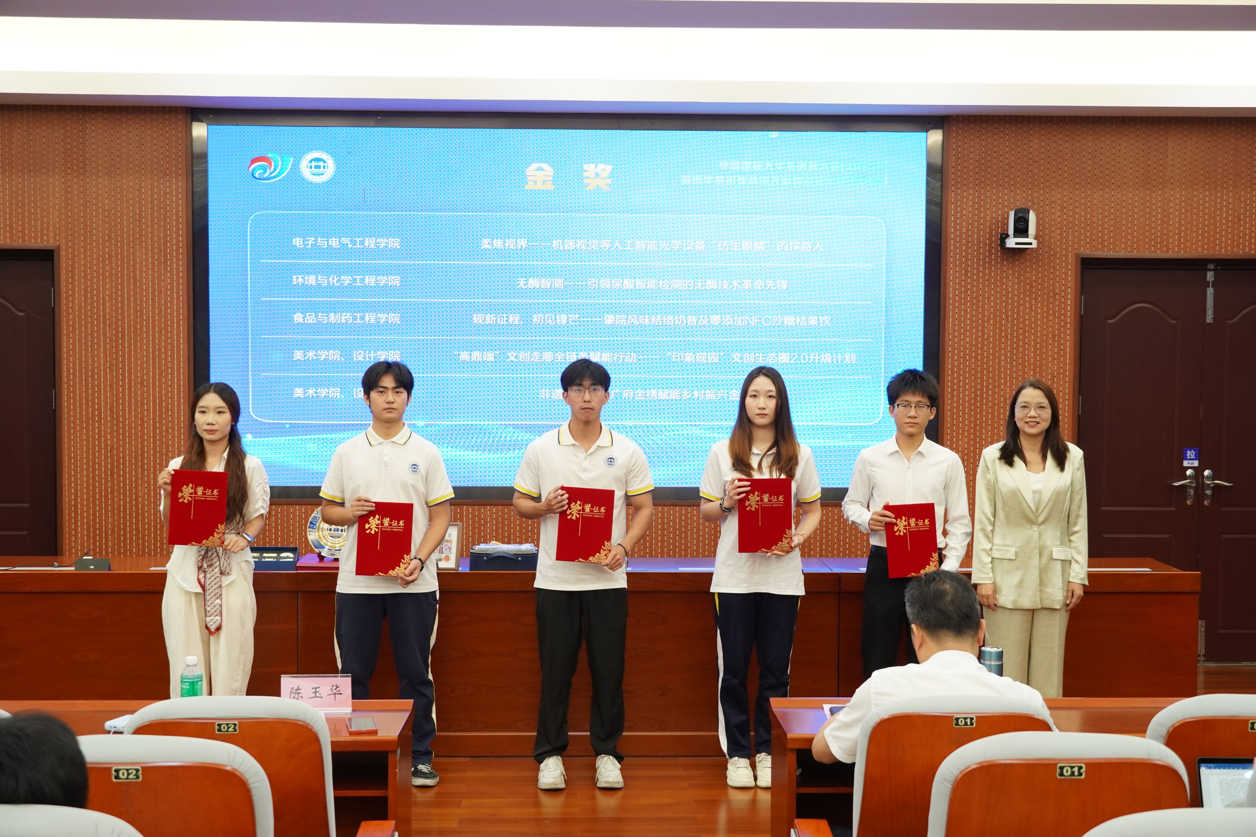 会上,优秀获奖项目代表进行汇报展示,分享了他们在化学检测、食品健康、文化创意等领域的创新成果。与会领导为校赛获得优秀指导教师、金奖、银奖、铜奖的项目团队颁发荣誉证书。