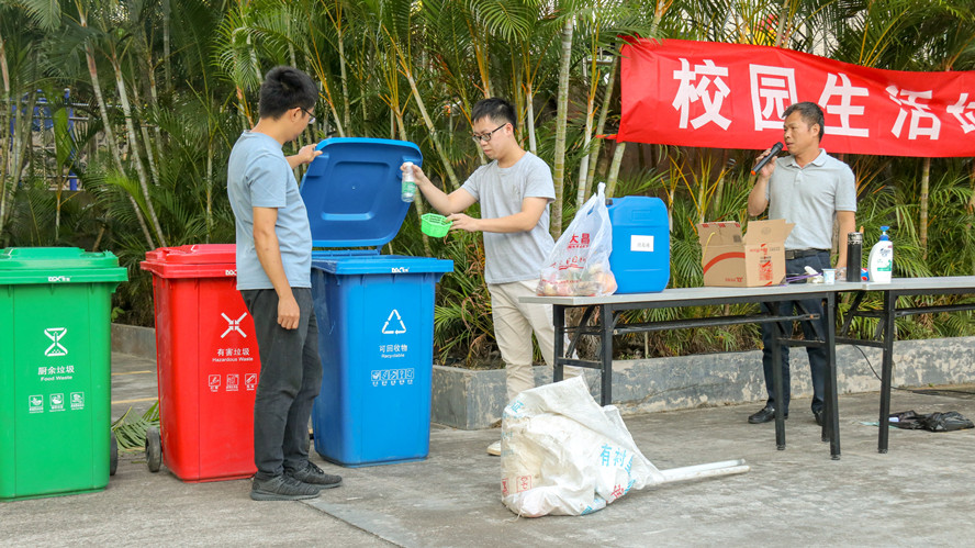 本次活动旨在让师生对垃圾分类形成更深刻的理解与认识,对垃圾分类的重要性与意义上形成共识。现场,工作人员讲解了可回收物、有害垃圾、厨余垃圾、其他垃圾的不同分类概念、种类类别、投放注意事项等,并现场演示四类垃圾具体投放操作方法。现场观众对各类垃圾具体处理方法展开提问,工作人员一一解答。目前,bat365两个校区共设定5个四分类垃圾桶投放点,其中主校区4个,星湖校区1个。此外,教学楼和办公区域设定两分类垃圾桶,生活区设定三分类垃圾桶投放点。