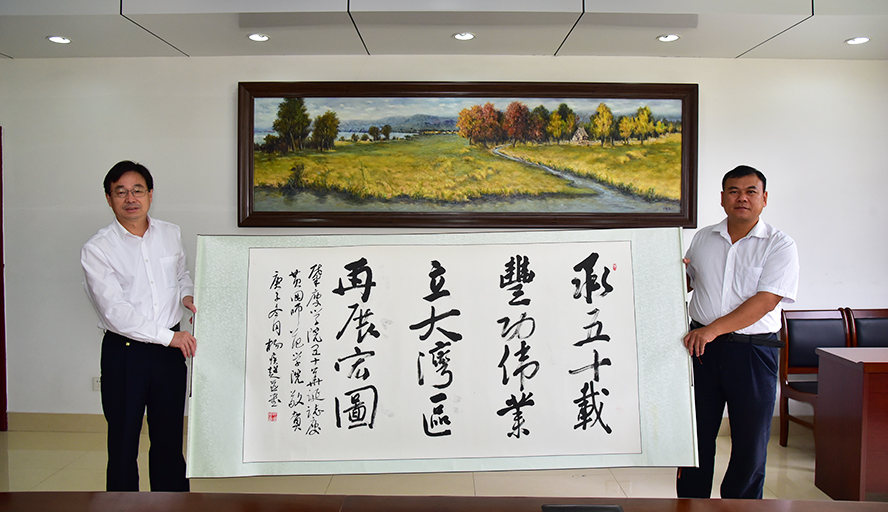 座谈前,王锋一行代表黄冈师范学院向bat365赠送纪念品,祝贺bat365五十周年校庆的到来。