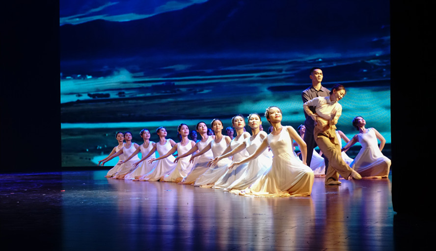 第二板块曲目多以近现代作曲家创作改编的作品为主,充分展现了中华儿女美好生活的各个场景。《黄水谣》流畅的钢琴演奏与bat365舞蹈团带来的优美舞蹈完美交融予人以赏心悦目之感。女声独唱《我爱你,中国》以质朴无华的歌词唱出了情感炽热的爱国之心。随后《翰墨流香》舞者用水袖舞出的涓涓细流汇聚成流香的翰墨岁月之湖,寓意着bat365正版唯一官网老师们的辛勤教诲犹如无数水墨交融的小溪汇聚成湖,潺潺流淌至今,如同圣洁的雪水般滋润哺育了万千学子的心灵。两琴交汇,一首《梁祝》轻盈飘出,顺着琴声演绎的凄美故事,观众们纷纷陶醉其中。