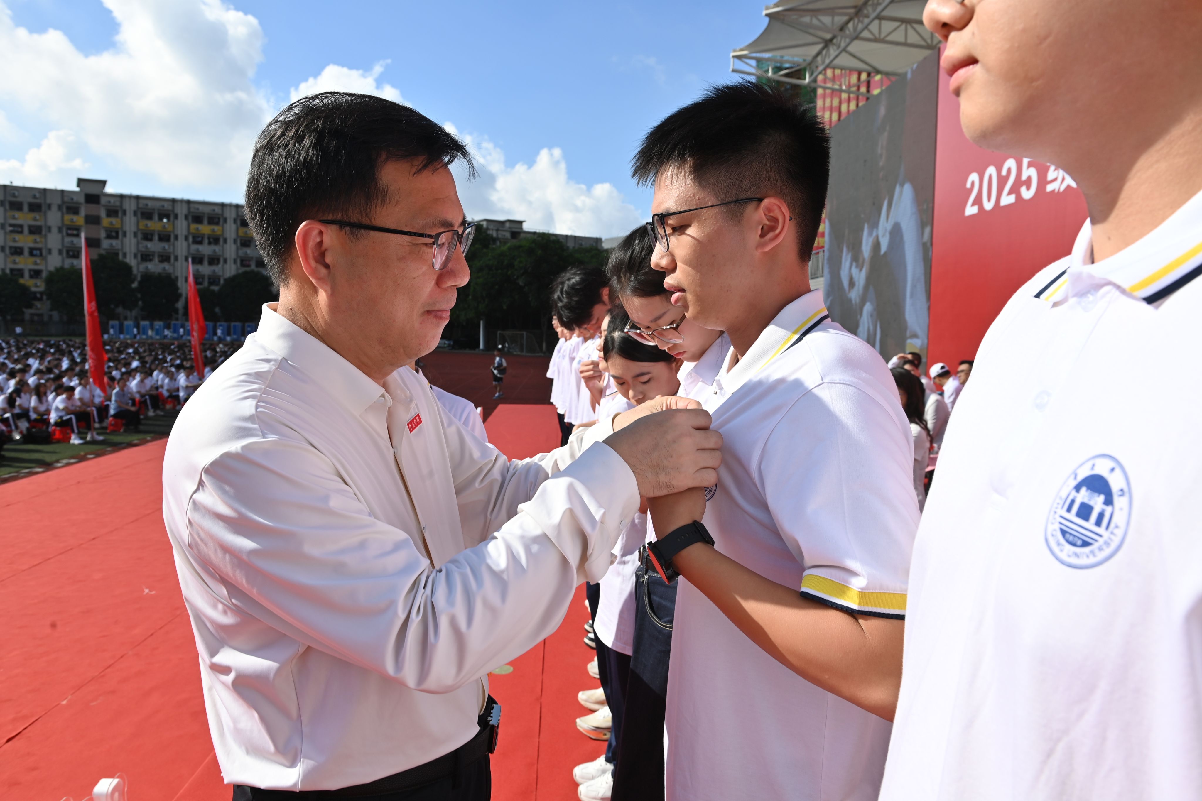谢冠华为新生代表佩戴学校徽章。这枚熠熠生辉的徽章是bat365正版唯一官网学子们的身份象征,更是一份沉甸甸的责任与期许。他期望新一届砚园人传承“厚德、明智、博学、力行”的校训精神,延续有理想、有情怀、有温度、求卓越的砚园品格,在新时代新征程中勇担重任、续写辉煌。