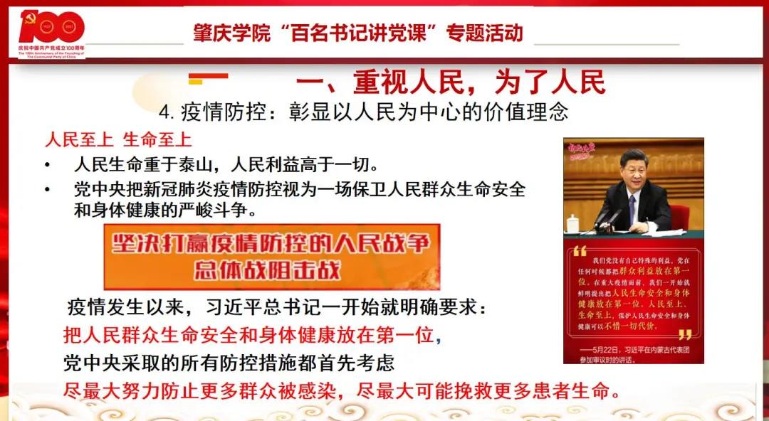 黄劲松表示,中国共产党的领导是历史的选择,人民的选择,时代的选择。百年来,中国共产党致力于三件大事:让中国站起来、让中国富起来、让中国强起来。他从四个方面解答“中国共产党为什么能?”:一是重视人民,为了人民;二是主义第一,信念坚定;三是实事求是,勇于革新;四是选贤任能,领导力强。中国的飞速发展彰显出社会主义制度优势、展现出社会主义发展前景、贡献出人类文明宝贵经验。