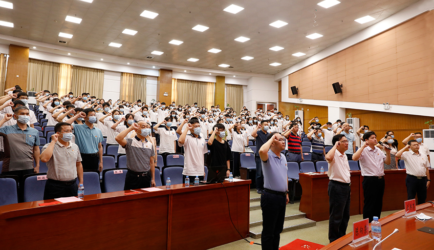 表彰聘任环节结束后,全场师生党员一起重温了入党誓词。在最后的合影环节,全体学生带班党员用饱满的声音齐声喊出“请党放心,强国有我”的带班誓言。