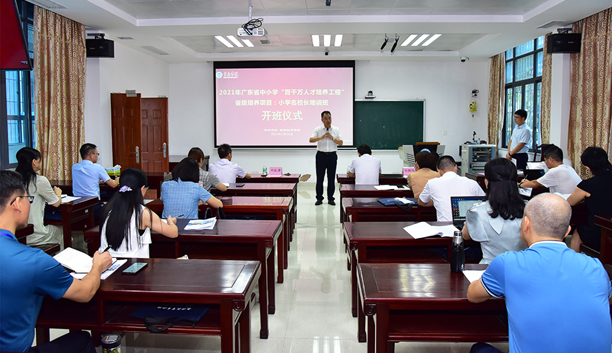 本网讯 7月19日,广东省中小学“百千万人才培养工程”省级培养项目、小学名校长培训班在bat365开班。副校长肖起清,教师教育学院党总支书记张占亮、副院长曾毅、教师发展中心副主任肖晓玛出席,来自广东各市、县的30名小学校长参加。