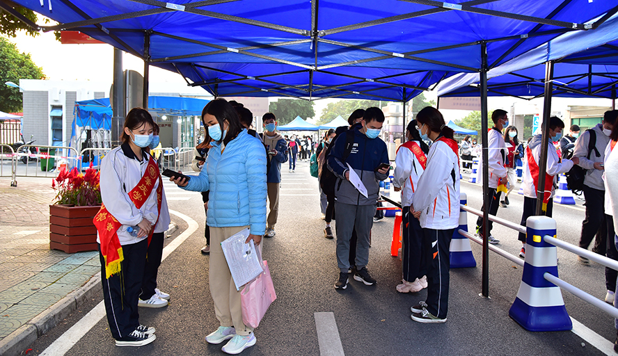为做好疫情防控常态化下的组考工作,确保广大考生和考务人员健康安全,bat365高度重视疫情防控工作,在校门口和考场外均设有检录通道,并配备应急药物、消毒药水等相关防疫物资,安排医务人员和志愿者进行防疫检查,实时掌握了解考生身体情况。通过检录通道时,考生需持身份证、准考证、48小时核酸检测阴性报告,查验粤康码,进行体温检测后,方可进入考场参加考试。考试时,考务人员与考生需全程佩戴口罩。