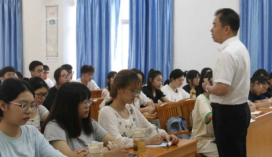 本网讯 9月20日,副校长肖起清以《学习“7·26”讲话,喜迎党的二十大》为主题,为教育科学学院2021级小学教育5班同学讲授新学期思政第一课。