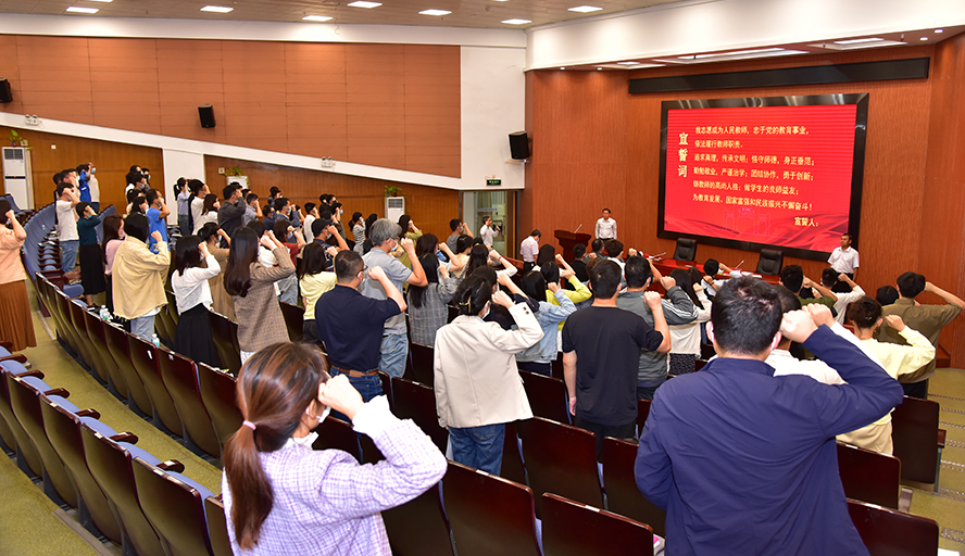 全体新入职教职工在人事处主持工作副处长黄剑青的带领下进行庄严宣誓。誓词明确,要忠诚于党的教育事业,依法履行教师职责,做到追求真理、传承文明、恪守师德、身正垂范、勤勉敬业、严谨治学、团结协作、勇于创新,铸就教师的高尚人格,成为学生的良师益友,为教育发展、国家富强和民族振兴不懈奋斗。