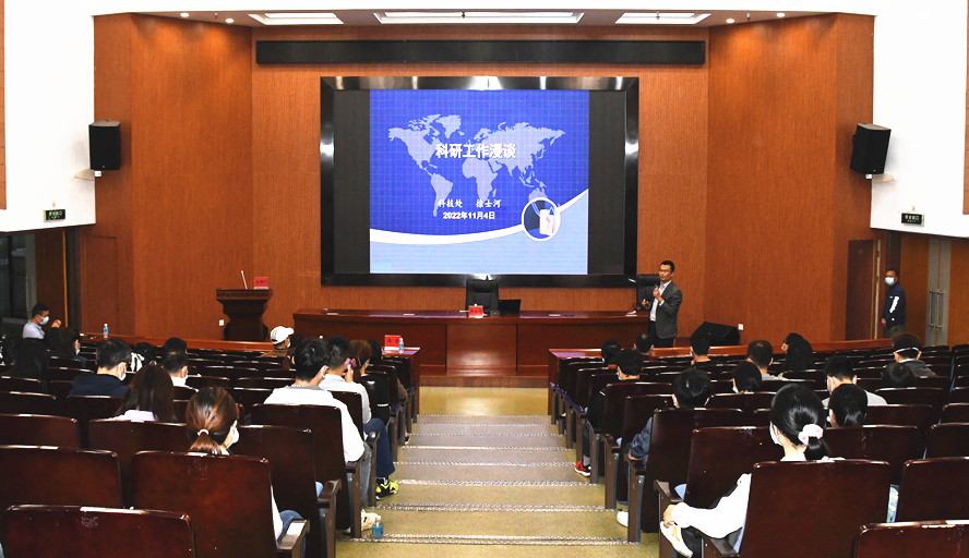 徐士河围绕学校科研工作现状、科研工作制度、如何申报科研项目等内容展开介绍,强调科学研究是学校发展、教师自我提升、教师队伍专业化建设的重要途径,鼓励新入职教职工关注科研、重视科研、加强学术交流,不断提升科研水平。