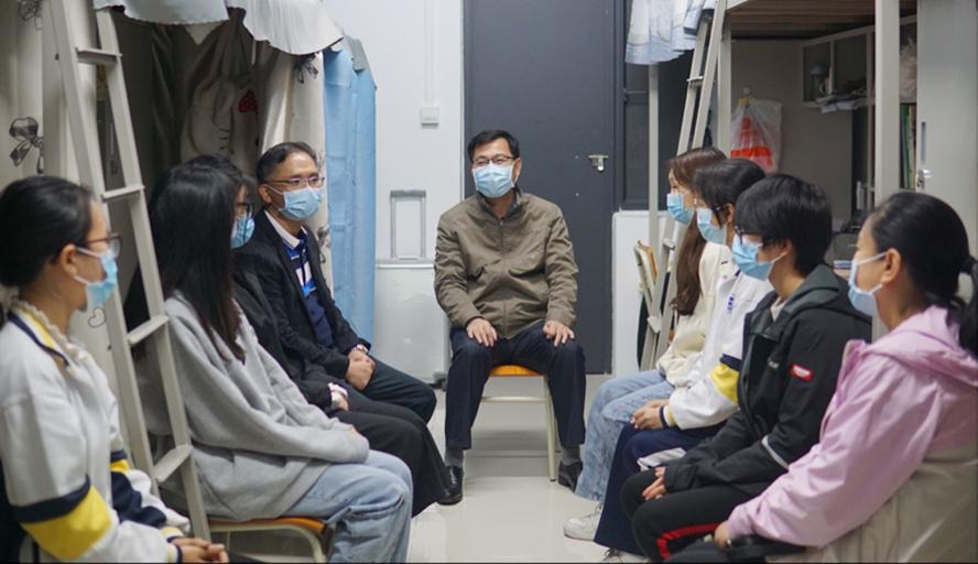 谢冠华向在座的同学们讲解学校疫情防控的政策要求,传达学校关于疫情防控工作的相关措施,教育引导同学们在封闭式管理期间要调整好心态,做好个人防护。在交谈中,谢冠华对同学们提出希望,一是鼓励同学们合理安排学习和生活、认真学习专业知识,除了完成常规课程外,也要积极参加体育锻炼。二是及时做好职业生涯规划,结合专业特色,积极参加校院两级社团和艺术团体,提高自身素质。三是向榜样学习,向不怕苦不怕累的援藏支教师兄师姐学习,学习他们牢记使命、不畏艰辛、迎难而上的精神。四是提醒同学们在宿舍注意用电安全。