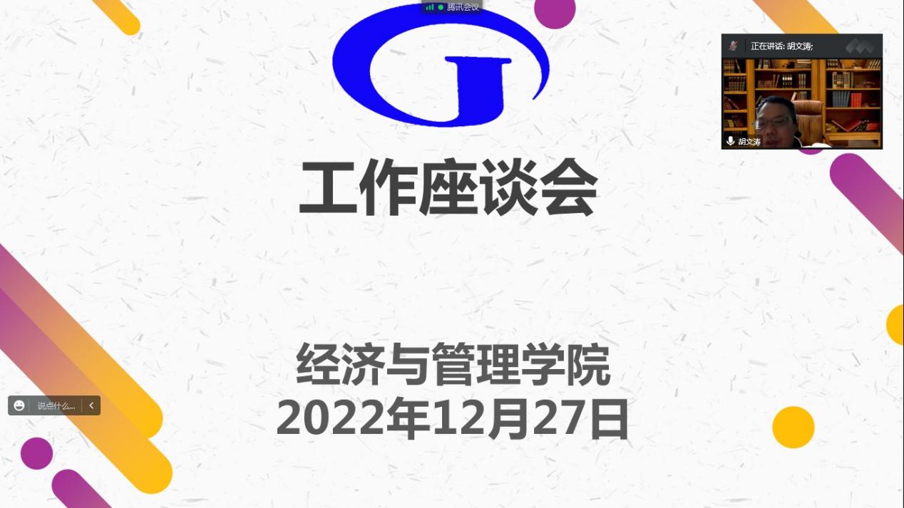本网讯 1227日晚,胡文涛副校长参加经济与管理学院班子在线上召开的年终工作座谈会,总结上一年成绩,展望新一年发展。学院党委书记黎天宇主持,学院党政班子成员和重点学科负责人李华军参加。