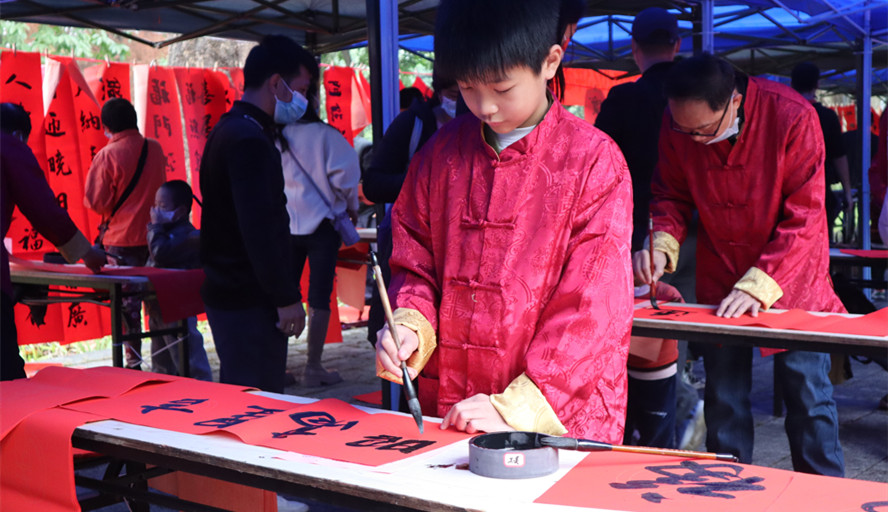 “福气降临阖家福,春光辉映满堂春”“瑞日祥云弥画栋,春风淑景满华堂”……书法家们即席下笔,书写各式字体的“福”字和新春对联,带着墨香的春联和福字呈现在大家的面前,喜庆的年味儿可见可感。