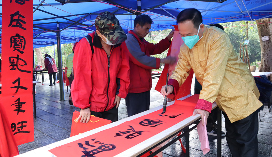 据了解,十五年以来,每年春节前,市书法家协会都会组织书法家们走进社区、学校、乡镇、企业,为各地群众写春联、送祝福,借以书法文艺实在地惠民,成为了肇庆市文化品牌之一。今年活动的初衷更是为了深入贯彻落实党的二十大精神,坚定文化自信,进一步弘扬中华优秀传统文化,向广大市民传递新春祝福,让福气以书法为载体送进千家万户。
