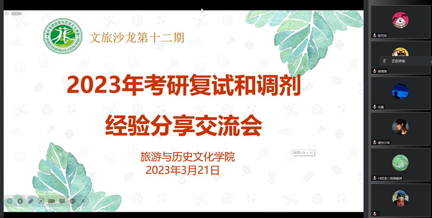 本网讯 322日,旅游学院线上举行2023年考研复试与调剂经验分享交流会,加强考研学生复试与调剂的分类指导,帮助其明确方向、了解资讯、掌握技巧,提高2023届毕业生考研录取率。院长李朝军、院党委书记杨雪梅出席。