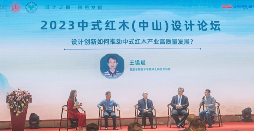 美术学院硕士研究生导师王锡斌教授应邀参加2023中式红木(中山)设计论坛,他与中国红木家具技术专家曹新民、中山职业技术学院红木家居学院执行院长潘质洪、中山市红木家具行业协会会长林志洪就“设计创新如何推动中式红木产业高质量发展”等问题,分别从工艺技术、设计审美、消费洞察、产品生态体系等方面为行业提供发展思路。