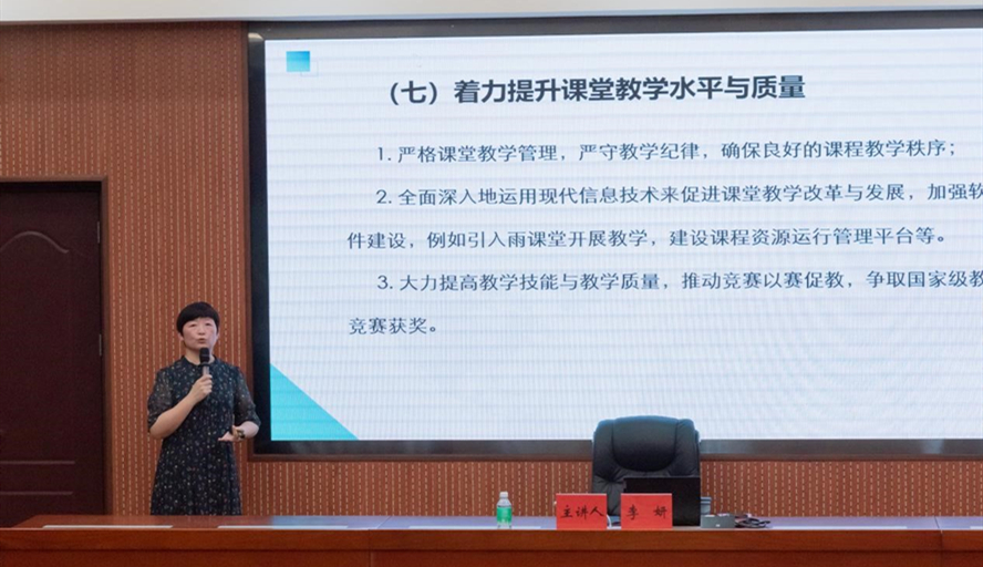 在教学专题培训会上,李妍以《bat365正版唯一官网教学管理与教学改革发展情况简介》为题,详细介绍学校教学基本情况、主要教学管理制度和改革与发展方向的内容。她提出,教育的改革和发展需从七个方面不断优化,一是提升专业内涵,加强专业建设;二是以一流课程为抓手,推动课程建设;三是培育优秀教学成果;四是加强教学团队与基层教学组织建设;五是推动教学评价改革;六是实现“学生中心”理念,深化学分制改革;七是着力提升课堂教学水平与质量。她建议新教师要建立自己的学术、工作和社会体系,履行对学生学术、职业和生活的三个导向职责,做好教学的本职工作。