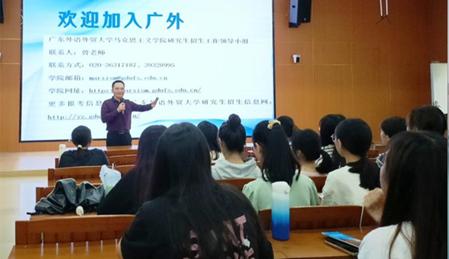 毛国民还面向思想政治教育专业学生开展了硕士研究生招生宣讲,从学院概况、学科特色、招生方向、导师简介、培养方式、奖助政策、报考事项等方面系统地介绍了广东外语外贸大学马克思主义学院深厚的学科优势和办学特点。
