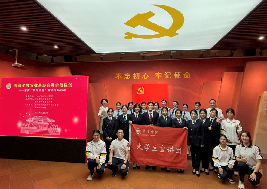 本网讯 10月18日,广东省委宣传部在肇庆市叶挺独立团团部旧址纪念馆举办打造全省首批基层宣讲示范队伍——肇庆“铁军讲堂”宣讲专场活动,校党委委员、宣传部统战部部长陈前带领大学生宣讲队成员参与本次活动。