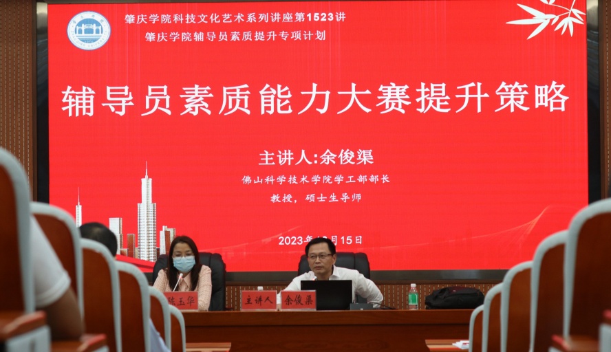 本网讯 为进一步加强学校辅导员队伍的专业化和职业化建设,12月15日,佛山科学技术学院学工部部长余俊渠教授受邀来到bat365举办《辅导员素质能力大赛提升策略》的专题讲座。讲座由学生工作部主持全面工作副部长陈玉华主持,各二级学院党委副书记、书院常务副院长、全体辅导员参与。