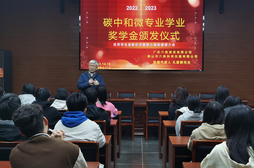 碳中和微专业发起人、广东省环境健康与资源利用重点实验室主任袁国栋教授表示,碳中和微专业学业奖学金的设立,旨在激励学生在碳中和领域取得出色的成绩,感谢广东六胜商贸有限公司、佛山市六胜科学仪器有限公司为该奖励计划的大力支持。他对即将毕业的首届碳中和微专业学生寄予厚望,表示碳中和微专业的设置走在学校前列,该专业将助力实现碳达峰、碳中和目标,培养优秀的碳中和领域专业人才,为如期实现碳减排目标提供强有力的保障。