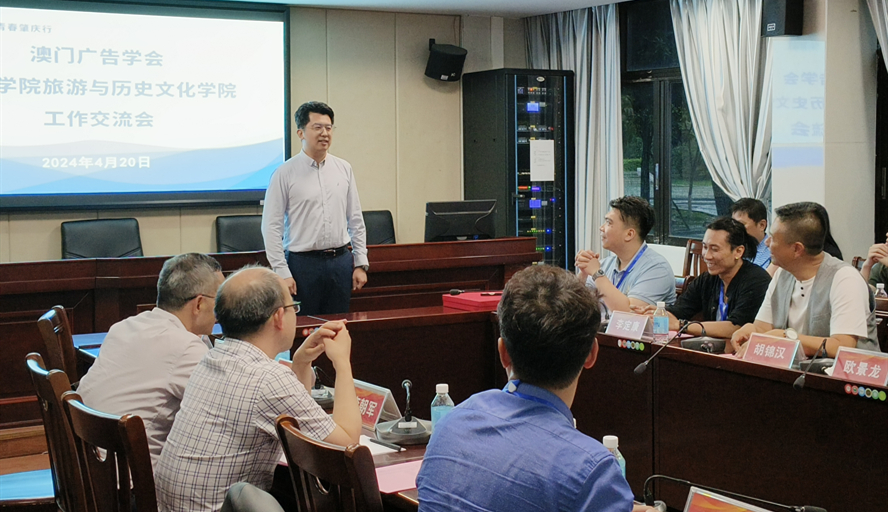 本网讯 4月20日,澳门广告学会会长胡锦汉、理事长李定康、副理事长甘伟俊带领澳门青年学生20多人到旅游学院开展“港澳青年看祖国—青春肇庆行”文化交流活动。共青团肇庆市委员会副书记欧景龙、青少年发展部部长何婉毅、青少年发展部挂职干部冼淑桦以及旅游与历史文化学院院长李朝军、副院长廖继武、实践教学部主任符兰冰等师生代表参加。