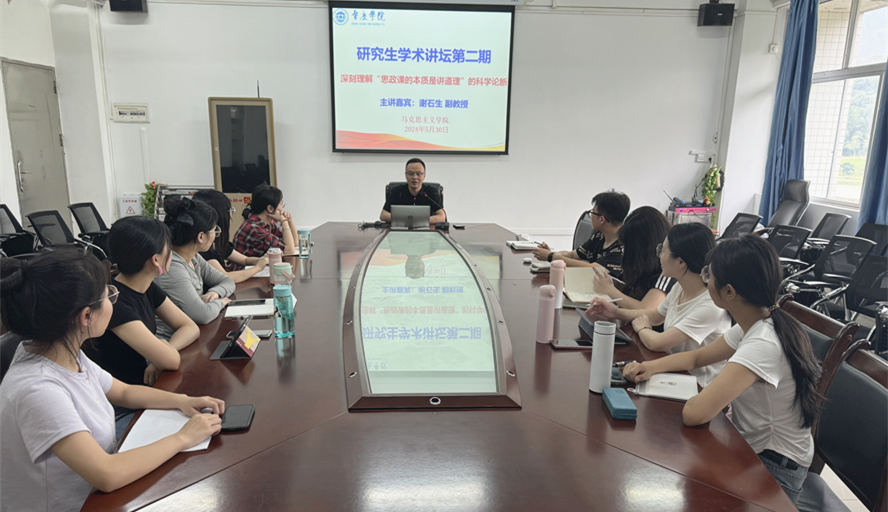 本网讯 5月30日,马院第二期研究生学术讲坛在学院会议室举行。学院谢石生副院长以《深刻理解“思政课的本质是讲道理”的科学论断》为题,从“思政课的本质是讲道理”的依据、指向、举措等三个方面展开阐释,并鼓励研究生们日后作为一名思政课教师要注重方式方法,把道理讲深、讲透、讲活,让思政教育真正走进学生的心里。