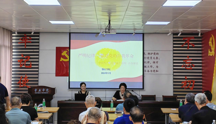 本网讯 6月20日,为深入学习宣传贯彻《中国共产党纪律处分条例》(以下简称《条例》),离退休党委在初心堂开展党纪学习教育,邀请了马克思主义学院副院长林润燕主讲。离退休党委书记黎玉玲主持,副书记邓泽南、党支部书记、党支部委员、全体在职人员等参加学习。
