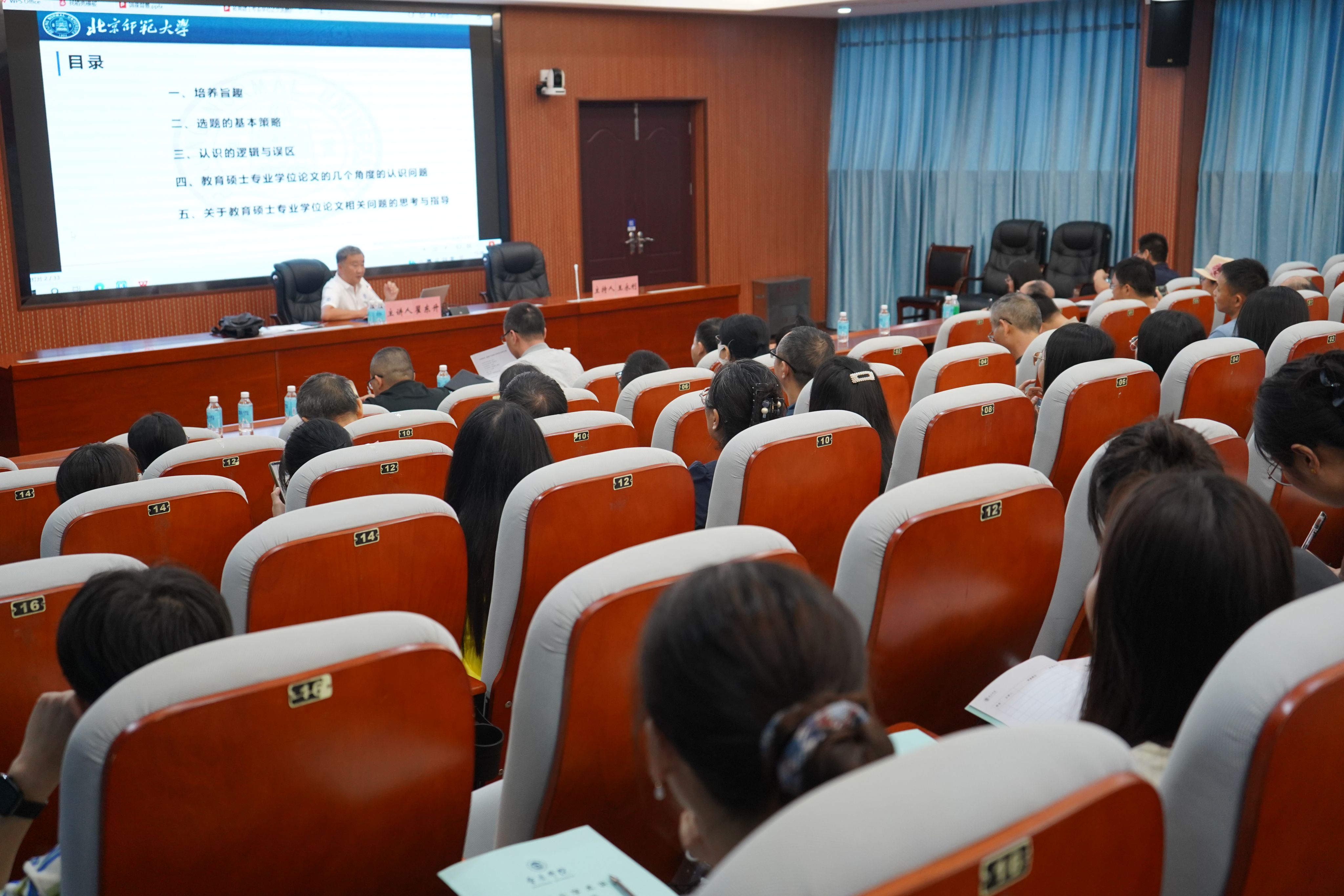 本网讯 9月8日,研究生院邀请全国教育专业学位研究生教育指导委员会原秘书长翟东升教授来bat365开展题为《教育硕士专业学位论文选题的逻辑与认识》的专题讲座。讲座由我院副院长王永利主持,教育管理、学科教学(思政)、学科教学(语文)、学科教学(数学)四个教育硕士专业领域培养学院的院领导、导师及研究生共同参加了讲座。