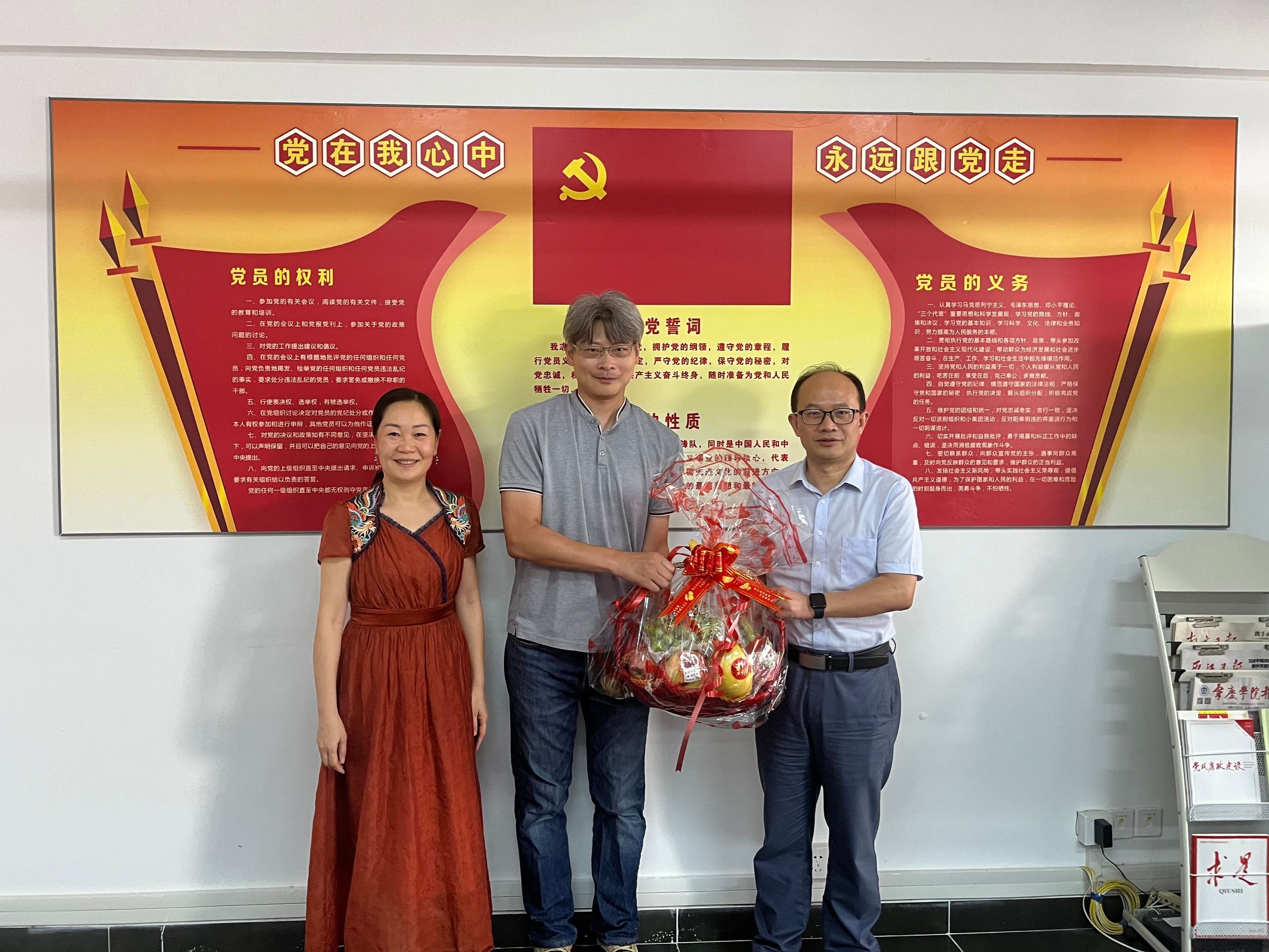 本网讯 在中秋佳节来临之际,食品与制药工程学院学院党委书记林晓忠、院长汪洪武慰问学院台湾籍教师,向台籍教师致以节日祝福,对他们为学院的发展、学生的培养等方面做出的贡献表示诚挚感谢,