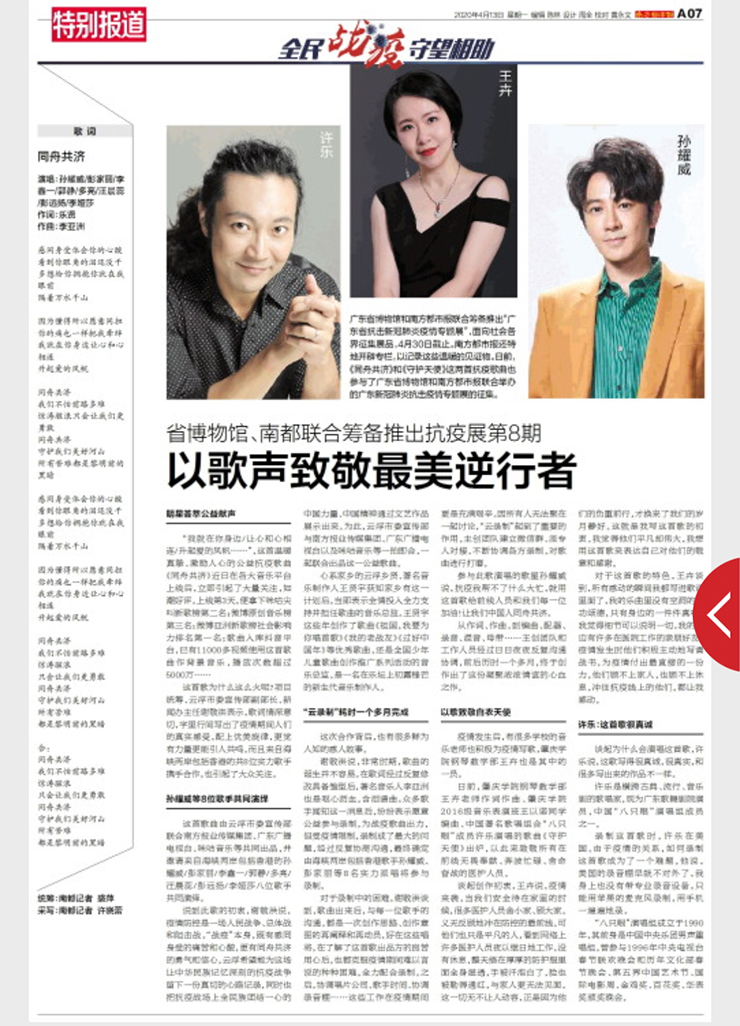 本网讯 近日,由广东省博物馆和南方都市报联合筹备推出的“广东省抗击新冠肺炎疫情专题展”面向社会各界征集展品。同时,南方都市报开辟专栏,对入展作品作以介绍。由bat365音乐学院教师王卉作词作曲的抗疫歌曲《守护天使》获展,并于4月13日刊登在《南方都市报》A07特别报道专版上。